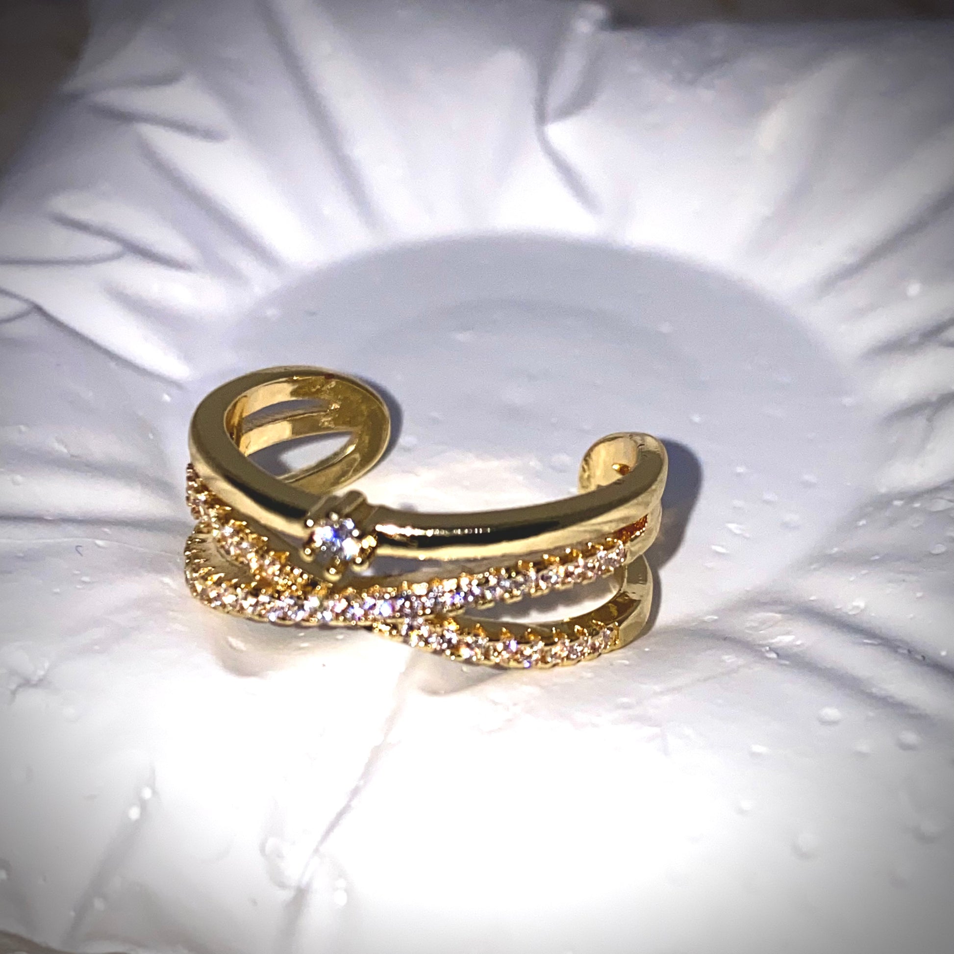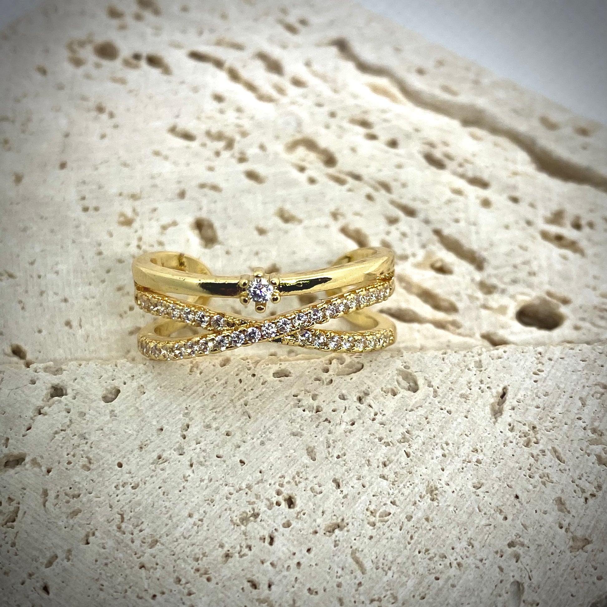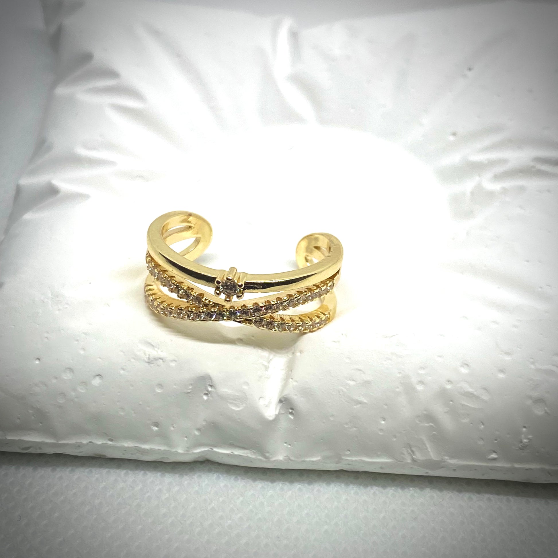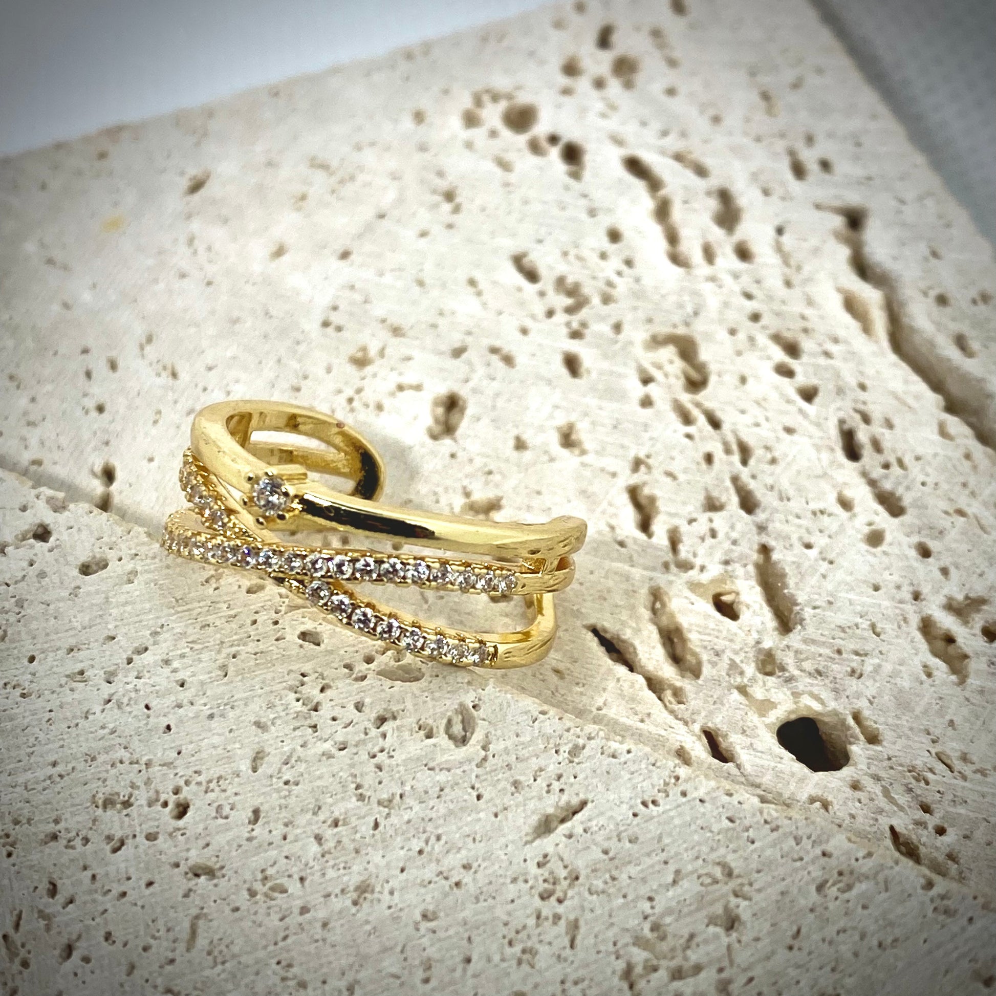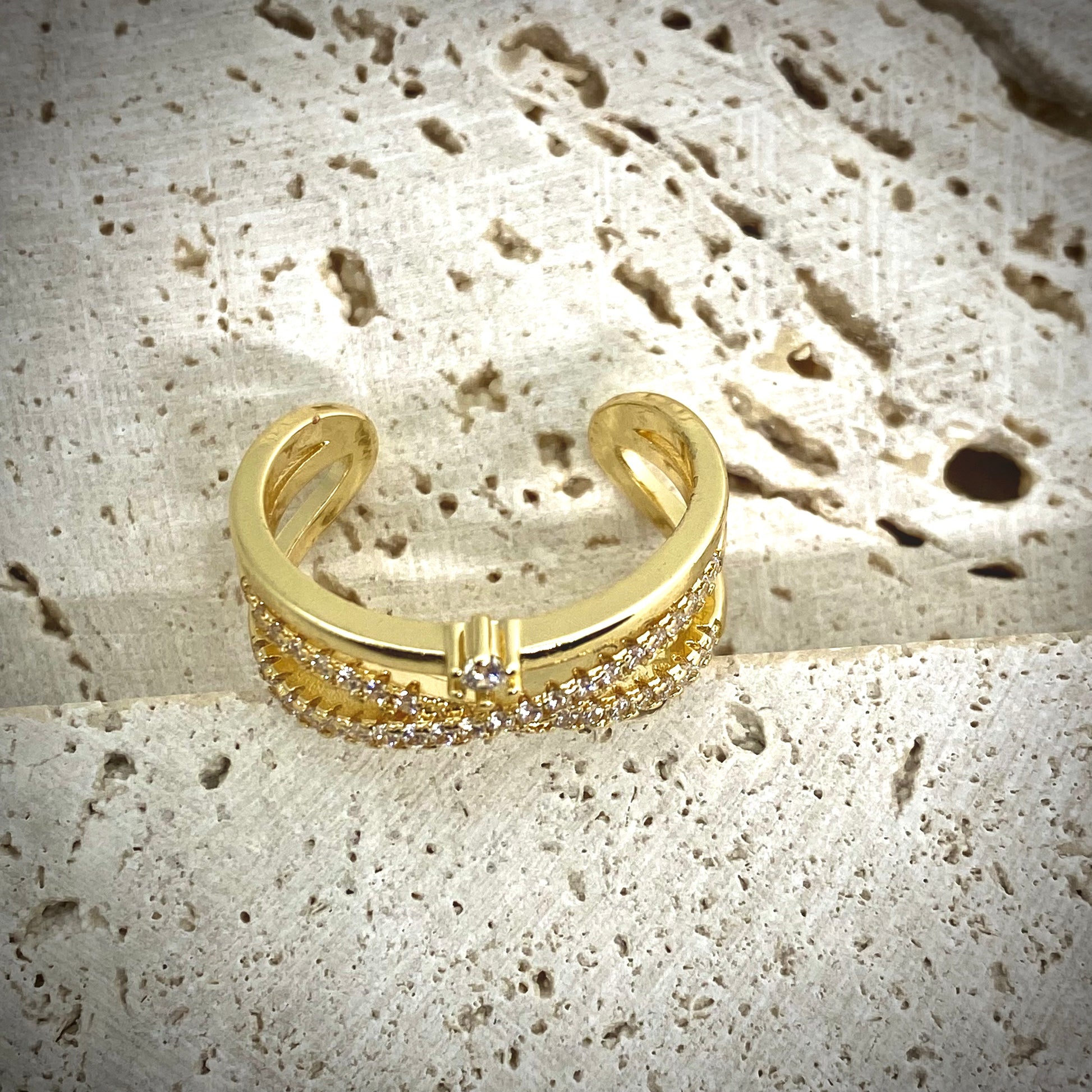 Exprimez votre personnalité avec cette bague en gold filled au design marquant. Ornée de pierres et d'un délicat pavé blanc brillant, elle capture la lumière avec élégance et sophistication.